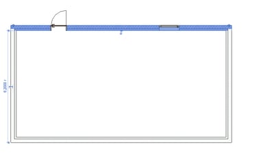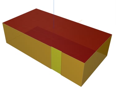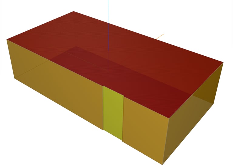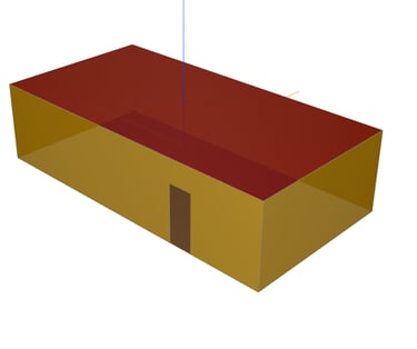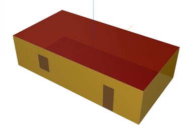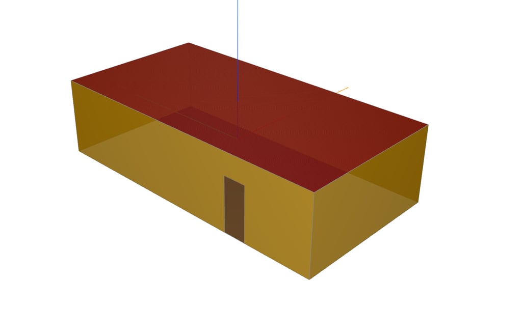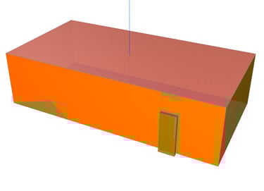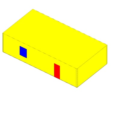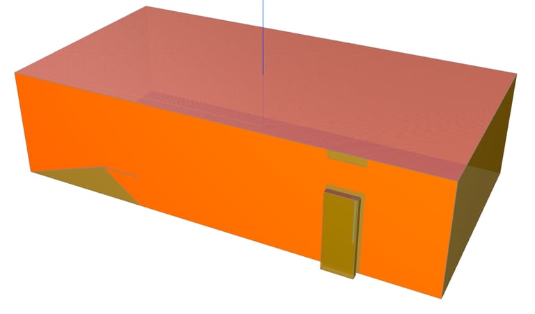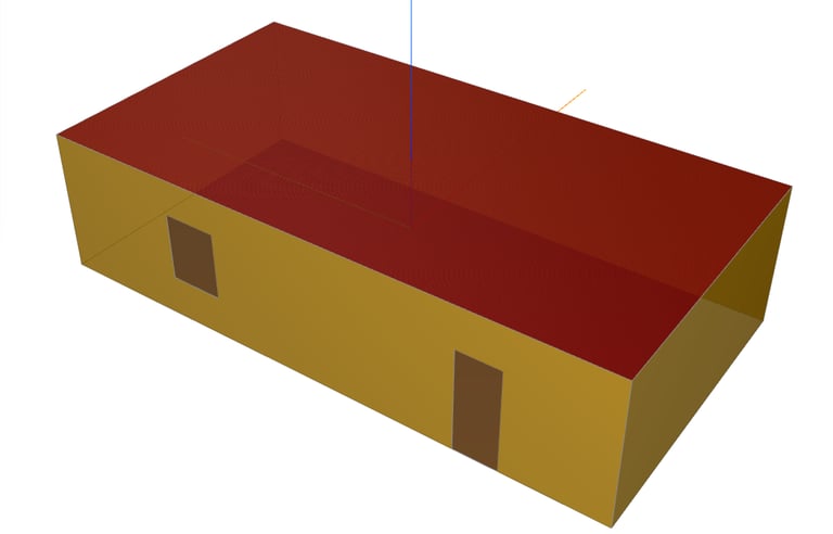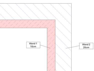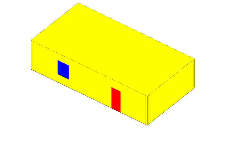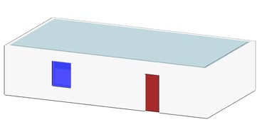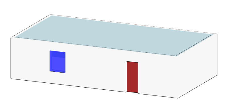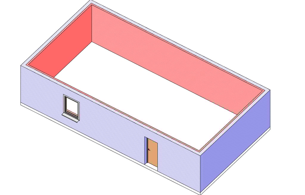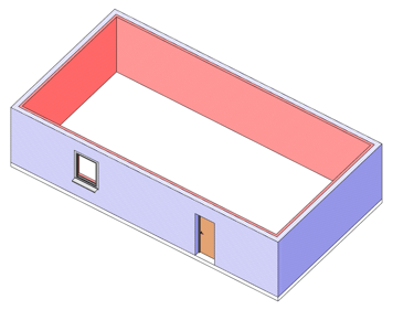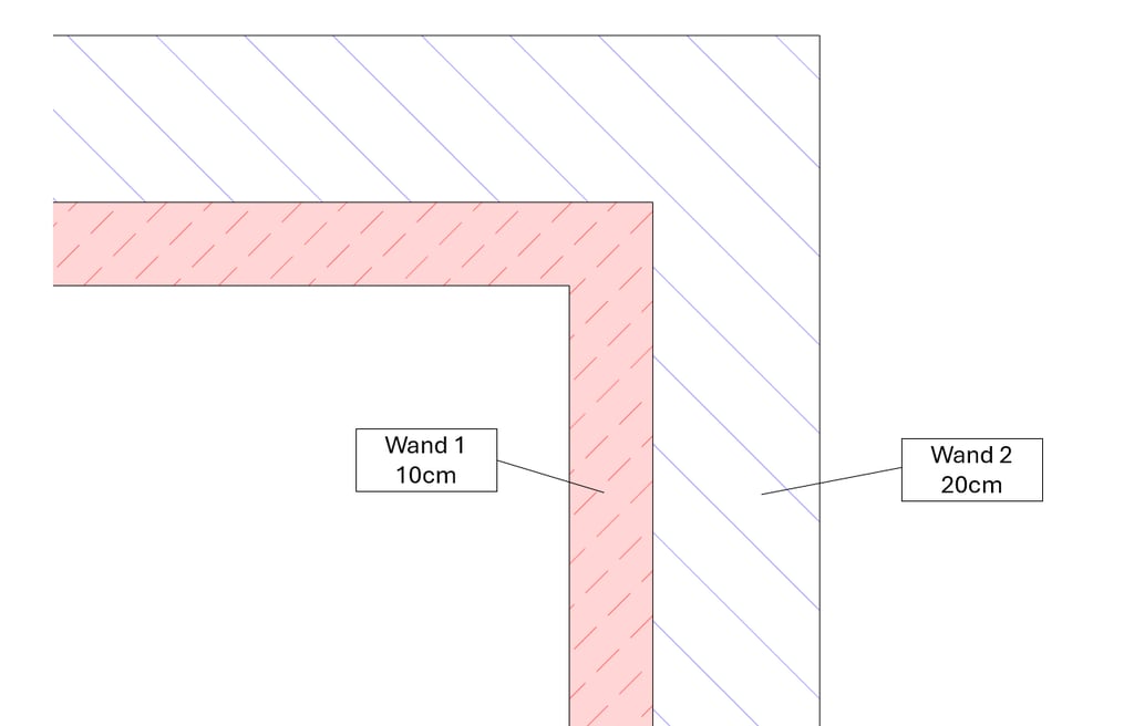 Ein Beispiel verdeutlicht diese Problematik: Wir haben ein rechteckiges Gebäude erstellt, bei dem die Außenwände aus zwei separaten Elementen bestehen, die jeweils eine Schicht von 10 cm (rot dargestellt) und 20 cm (blau dargestellt) aufweisen. In der ersten Schicht ist eine Tür platziert. Ebenso gibt es in dieser Schicht eine Wandöffnung vor dem Fenster. Das Fenster befindet sich in der zweiten Schicht.