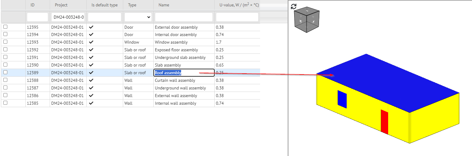 Erkannte Außenwände werden gelb, Fenster blau und Türen rot dargestellt. Die Flächen werden automatisch den gbXML-Standard-Surface-Typen zugeordnet und können für den gbXML-Export detaillierter klassifiziert werden. Benutzerdefinierte Typen können erstellt und über Multiselektion oder Filterung den Flächen zugewiesen werden, sodass diese einem spezifischen Typ aus dem Bauteilkatalog des Bauphysikers entsprechen.