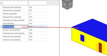 Durch einen Klick auf diese Zelle werden alle Bauteile mit diesem Schichtaufbau ausgewählt, sodass ein entsprechender U-Wert zugewiesen werden kann. Ebenso können diese Flächen einem eigenen Typ zugeordnet werden, der in der Berechnungssoftware über die vergebene Bezeichnung (z.B. AW01) auf das richtige Bauteil mit dem entsprechenden U-Wert gemappt wird.