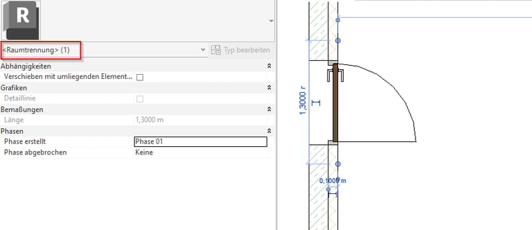 Ein weiteres Problem tritt auf, wenn Architekten Raumtrennlinien verwenden. Diese werden im gbXML-Export ebenfalls als Wandschicht erkannt, was dazu führt, dass dahinterliegende Objekte nicht mehr erkannt werden. Wenn in unserem Beispielmodell eine Raumtrennlinie vor der Tür platziert wird, wird die Tür nach dem gbXML-Export nicht mehr erkannt. Stattdessen wird die Raumtrennlinie als Fläche vom Typ „Air“ dargestellt.